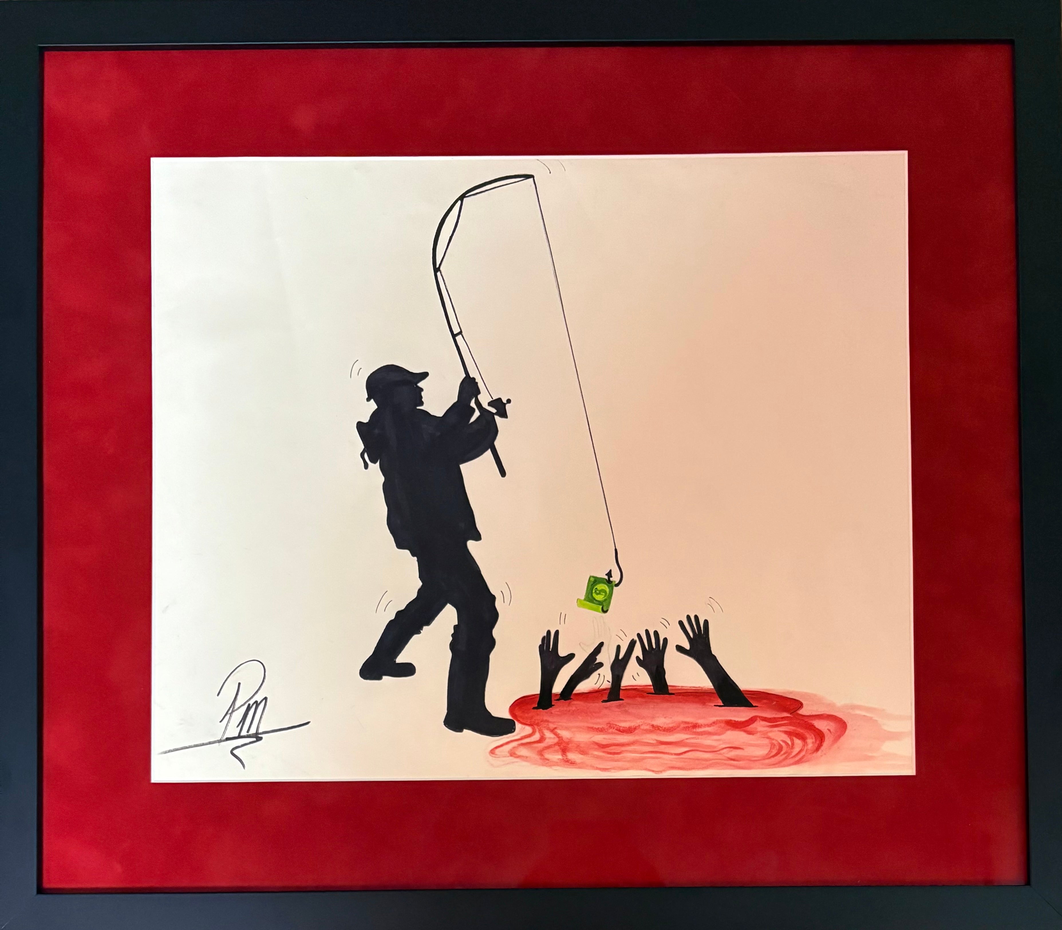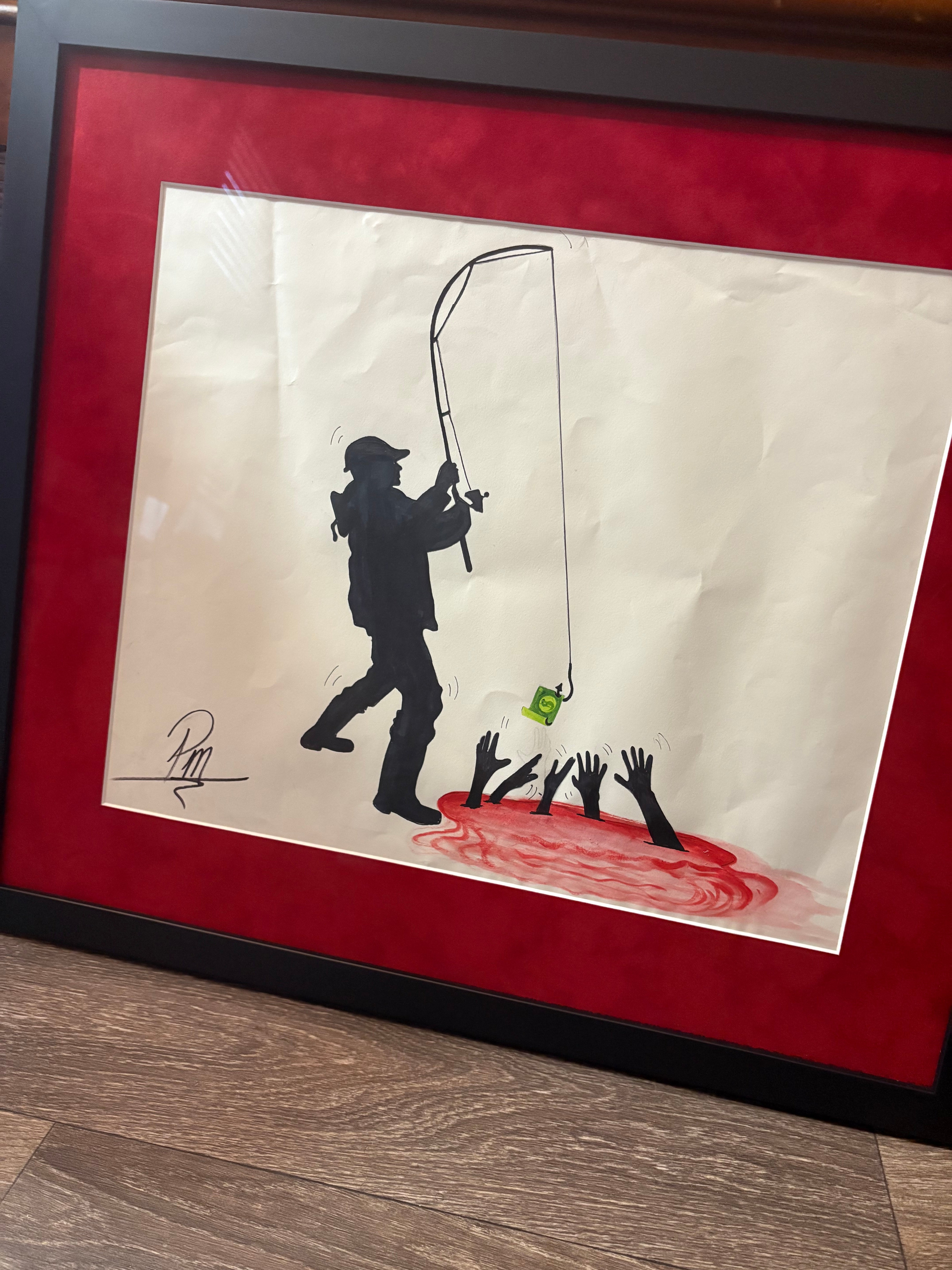 Art Money $ is a powerful original watercolor painting by Preston Mitchell. It confronts the uneasy relationship between art, money, power, and survival. Rendered with stark contrast and symbolic tension, the composition depicts a silhouetted figure fishing currency above a pool of reaching hands. Depicted is an unsettling metaphor for economic imbalance, creative labor, and the commodification of culture.