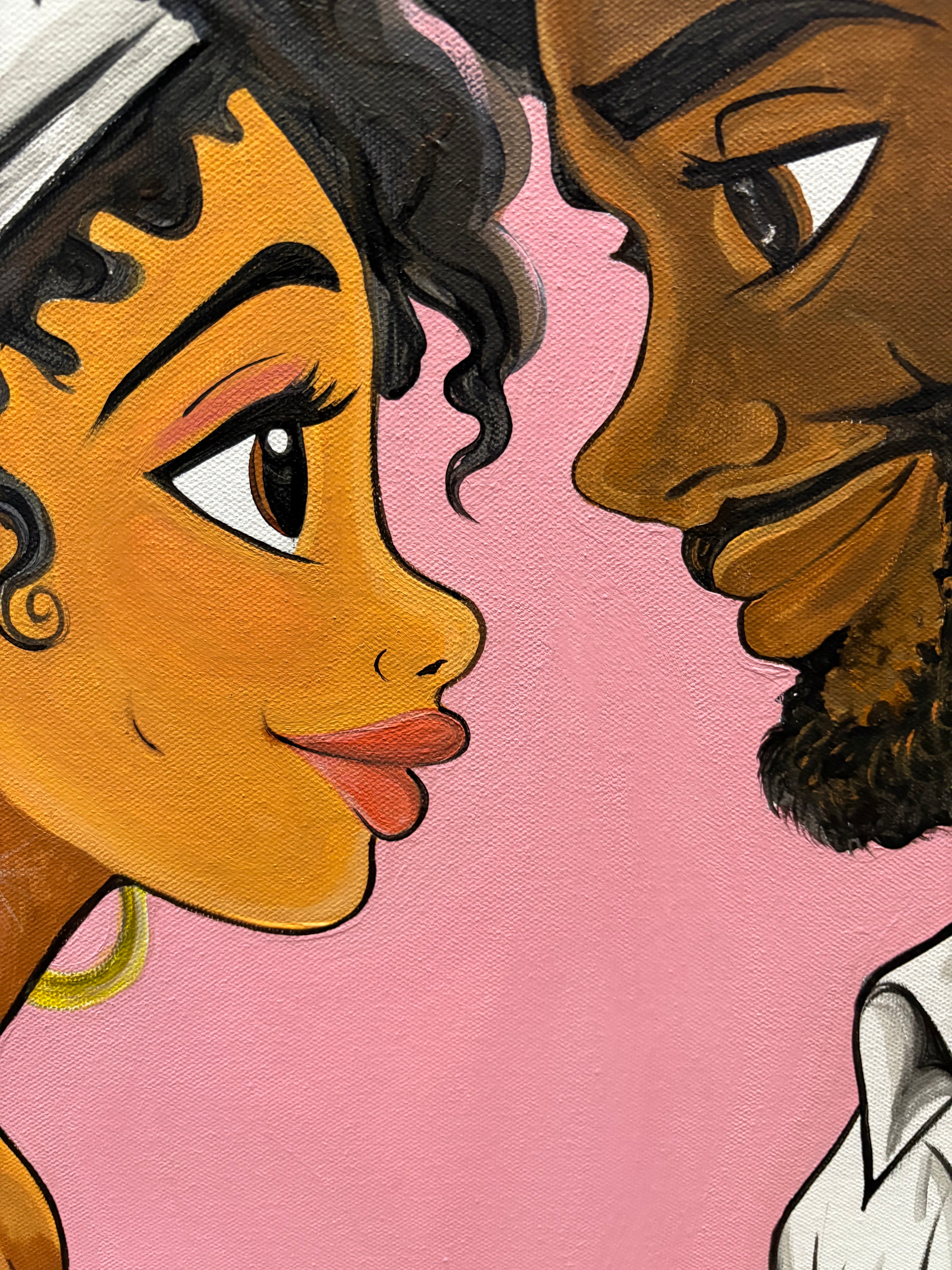 My Forever is a celebration of enduring Black love; soft, intentional, and deeply rooted. Framed within layered hearts, Earth Motherland & King Melanin face one another with warmth and certainty. Their connection quiet yet powerful. Their natural hair forms a shared silhouette, symbolizing unity, protection, and ancestral continuity. The gentle pink tones radiate tenderness, while the bold lines affirm strength and commitment.